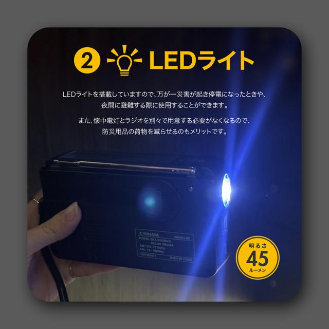 | LEDライトを搭載していますので、万が一災害が起き停電になったときや、夜間に避難する際に使用することができます。また、懐中電灯とラジオを別々で用意する必要がなくなるので、防災用品の荷物を減らせるのもメリットです。 |