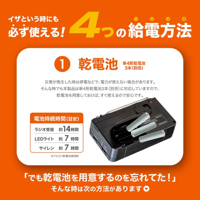 | 電池持続時間(目安) | ・アルカリ乾電池使用時:ラジオ受信 約14時間 / LEDライト 約7時間 / サイレン 約7時間 ・内蔵充電池使用時:ラジオ受信 約9時間 / LEDライト 約4時間 / サイレン 約4時間 |