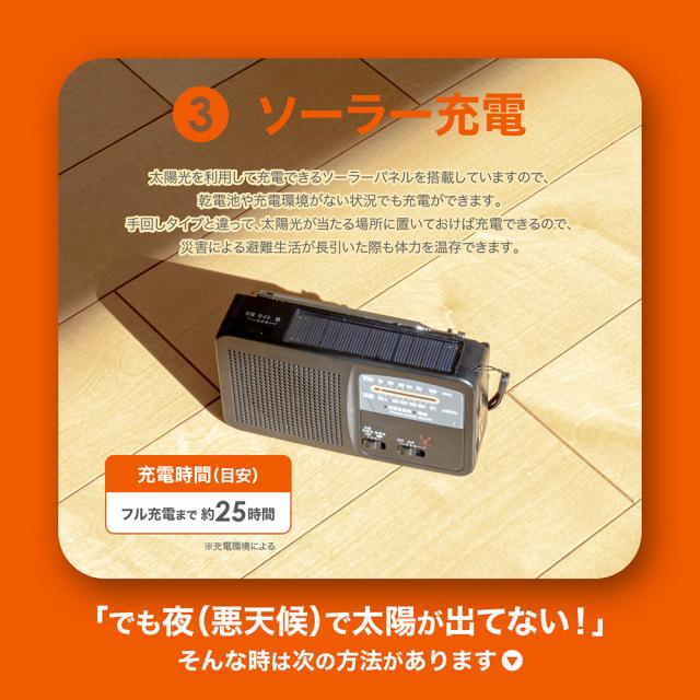 | 充電時間(目安) | ・手回し充電時(120回転/分で3分間充電した場合):ラジオ 約6分 / LEDライト 約30分 使用可能 ・ソーラーパネル充電時:フル充電まで約25時間(充電環境による) ・USB充電時:フル充電まで約9時間 |