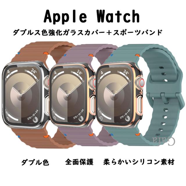 Apple watchバンドカバー アップルウォッチバンドカバーセット シリコンバンド ダブル色強化ガラスカバー Apple Watch 40mm 41mm 42mm 44mm 45mm 46mm 49mm