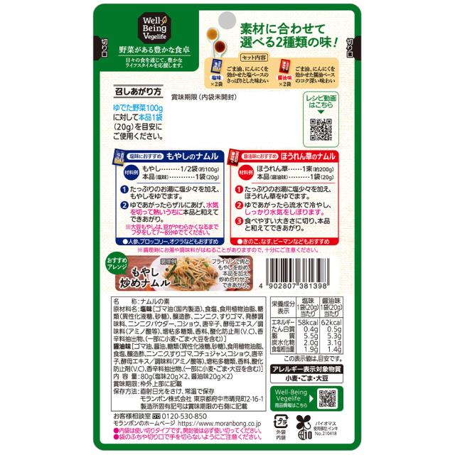 商品名 モランボン Well−Being Vegelife ナムルの素 80g×10個 容量 80g×10個 原材料名 塩味[ゴマ油(国内製造)、食塩、食用植物油脂、糖類(異性化液糖、砂糖)、醸造酢、ニンニク、すりゴマ、発酵調味料、ニンニクパウダー、コショウ、唐辛子、酵母エキス/調味料(アミノ酸等)、増粘多糖類、香料、酸化防止剤(V.C)、香辛料抽出物、(一部に小麦・ごま・大豆を含む)]醤油味[ゴマ油、醤油、糖類(異性化液糖、砂糖)、食用植物油脂、食塩、醸造酢、ニンニク、すりゴマ、コチュジャン、コショウ、唐辛子、酵母エキス/調味料(アミノ酸等)、増粘多糖類、香料、酸化防止剤(V.C)、香辛料抽出物、(一部に小麦・ごま・大豆を含む)] アレルギー特定原材料 小麦 賞味期限 商品の発送時点で、30日以上あるものをお届けいたします 保存方法 直射日光を避け、常温で保存してください。