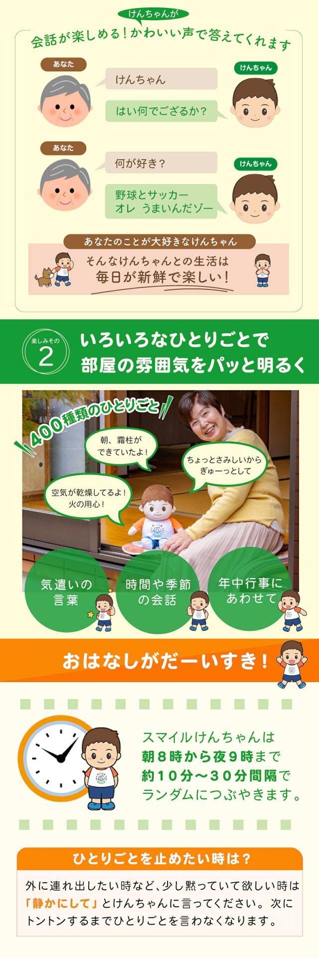 | 機能について 補足 | 誕生日のお祝い、占い、なぞなぞ、けんちゃん体操等、多彩な機能を搭載しています。難しい操作はありません。電池を入れて電源スイッチをONにして置いておくだけで、季節に応じた、こどもらしいひとりごとをお話ししてくれます。 |