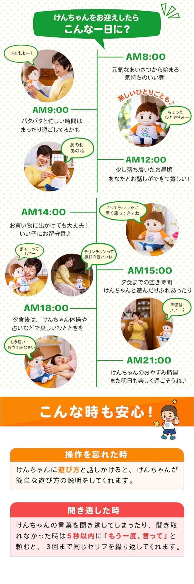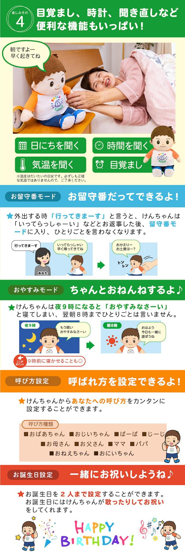 さらに「目覚まし機能」や、「今何時?」「今日は何日?」と聞くとその日の日付や曜日を教えてくれる「カレンダー」、けんちゃんのおしゃべりを聞き逃してしまった時には「もう一度言って!」と声をかけると同じ内容をリピートしてくれる「聞き直し」機能付きなので、聞き取れなかった場合なども安心です。