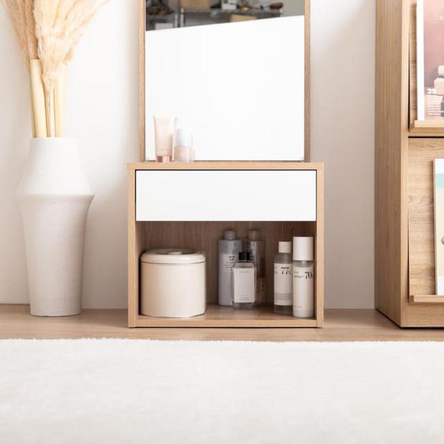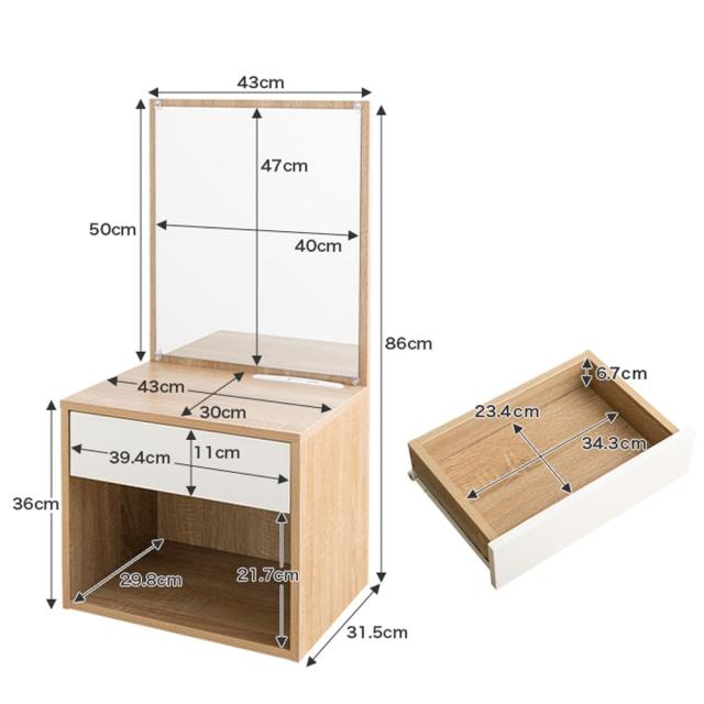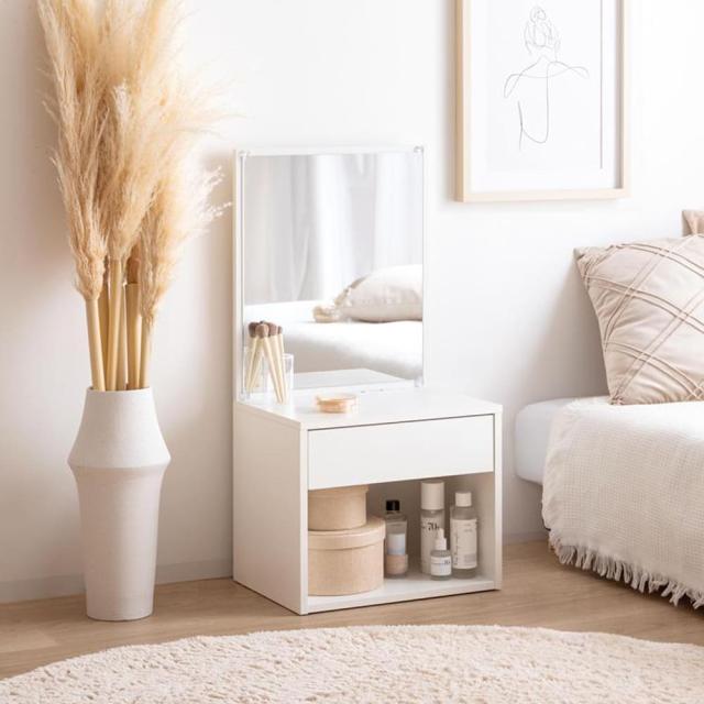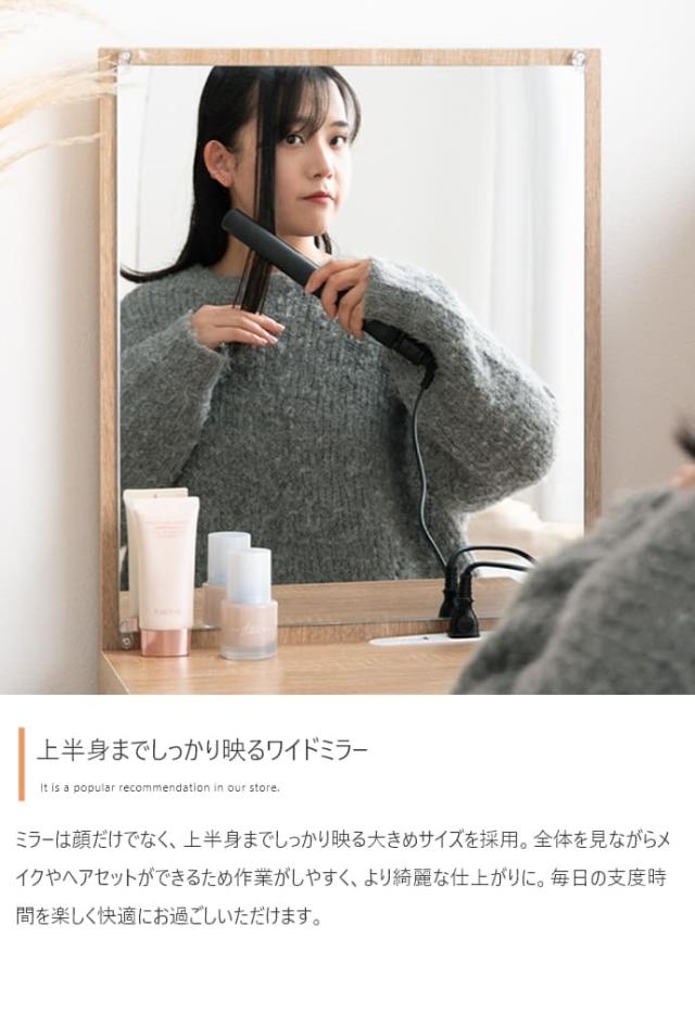上半身までしっかり映る大きな鏡と、たっぷり収納できる引き出し&オープンスペースで、毎日のメイクが快適に。