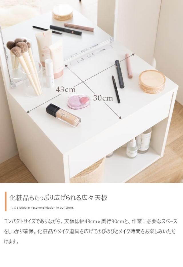 天板は幅43cm×奥行30cmと作業しやすい広さで、コスメをたっぷり広げても安心です。