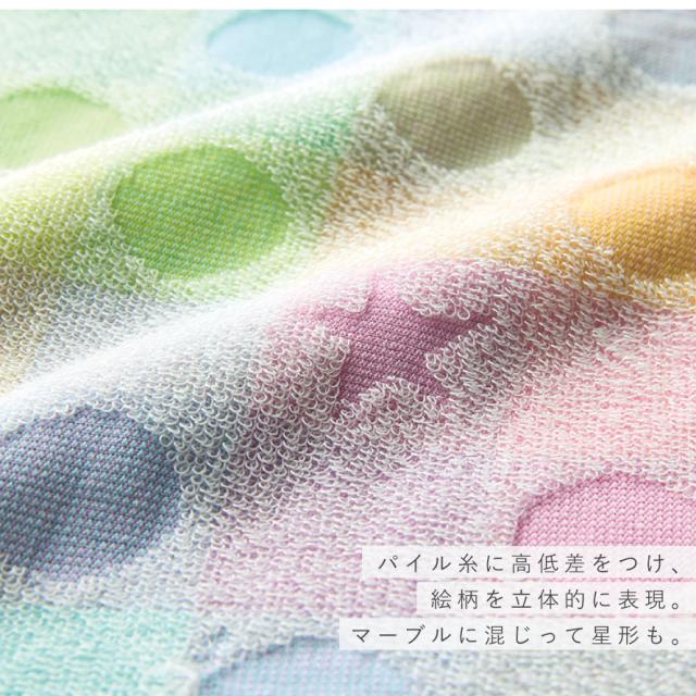 パイル糸に高低差をつけ、絵柄を立体的に表現。マーブルに混じって星形があるところも可愛いらしいポイント。
