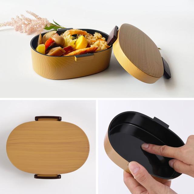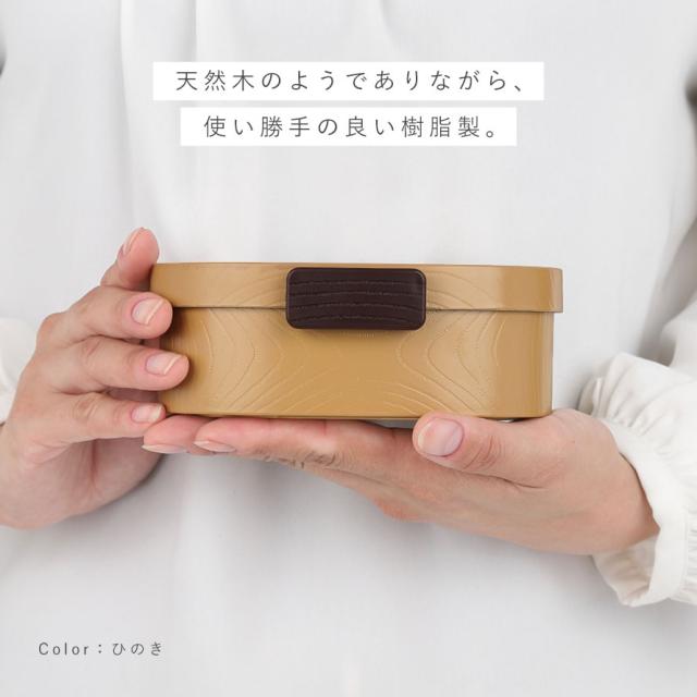 自然の温もりを感じさせる 木目調、わっぱ弁当風デザインのお弁当箱。本物の木のような質感を再現しつつ、軽くて扱いやすい樹脂製で、毎日のランチをもっと快適に。