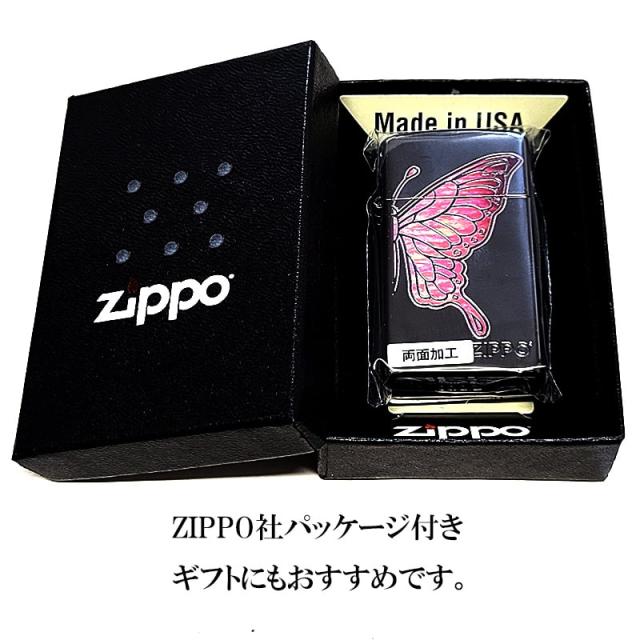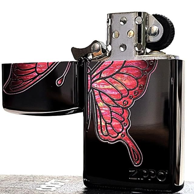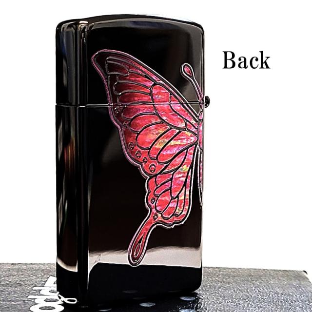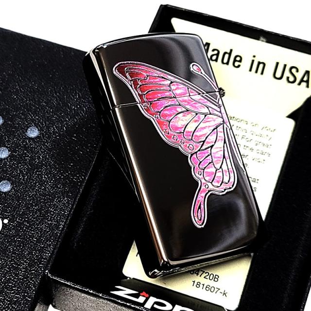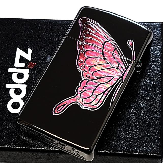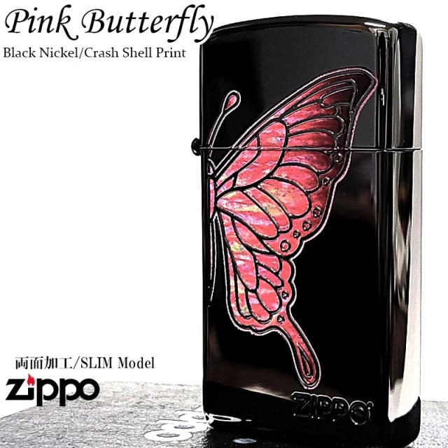 ZIPPO スリム 蝶 かわいい ピンクバタフライ ジッポ ライター シェル模様 ジッポロゴ おしゃれ 両面加工 美しい ブラックニッケル 彫刻 黒 レディース