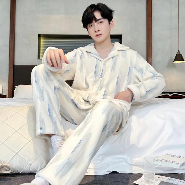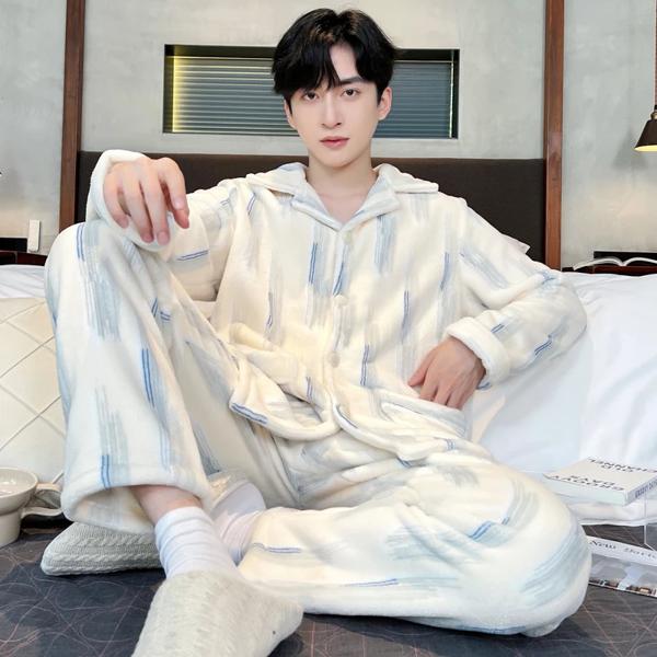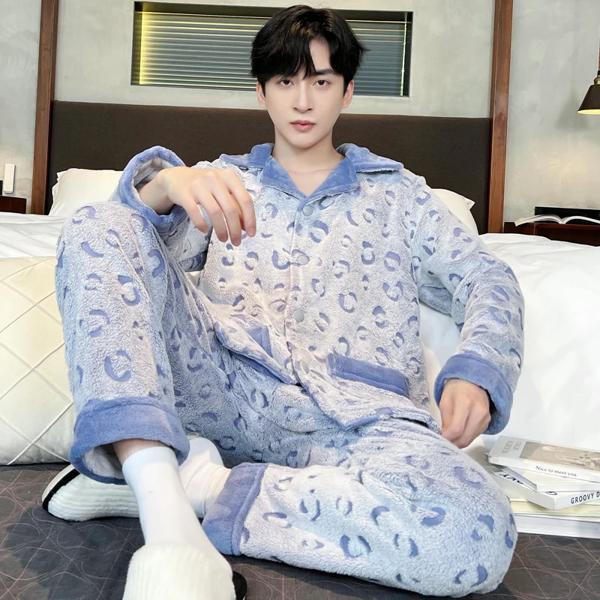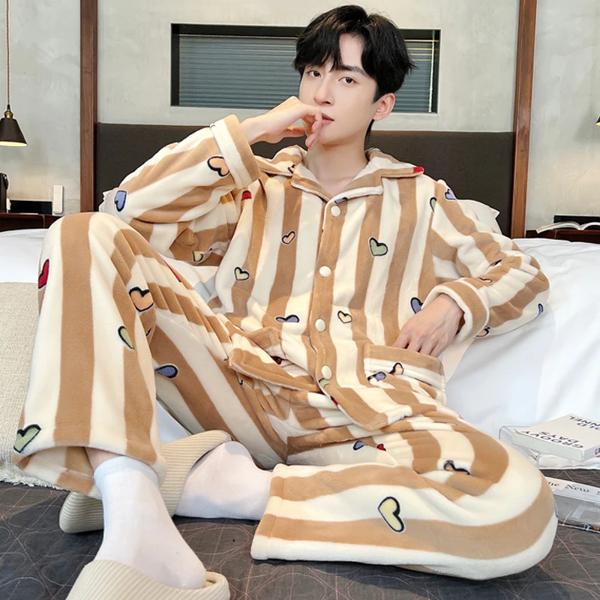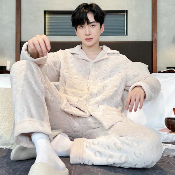 肥厚フランネルホーム服セット男性のためのシンプルなオープンカーディガンサンゴフリースパジャマ青少年学生高級長袖パジャマ