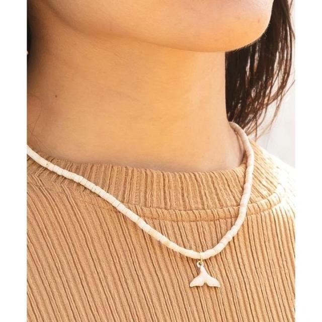 ウッドビーズとホエールテールのネックレス。ホエールテールは幸運を祈るアイテムとして、大人気のモチーフです。