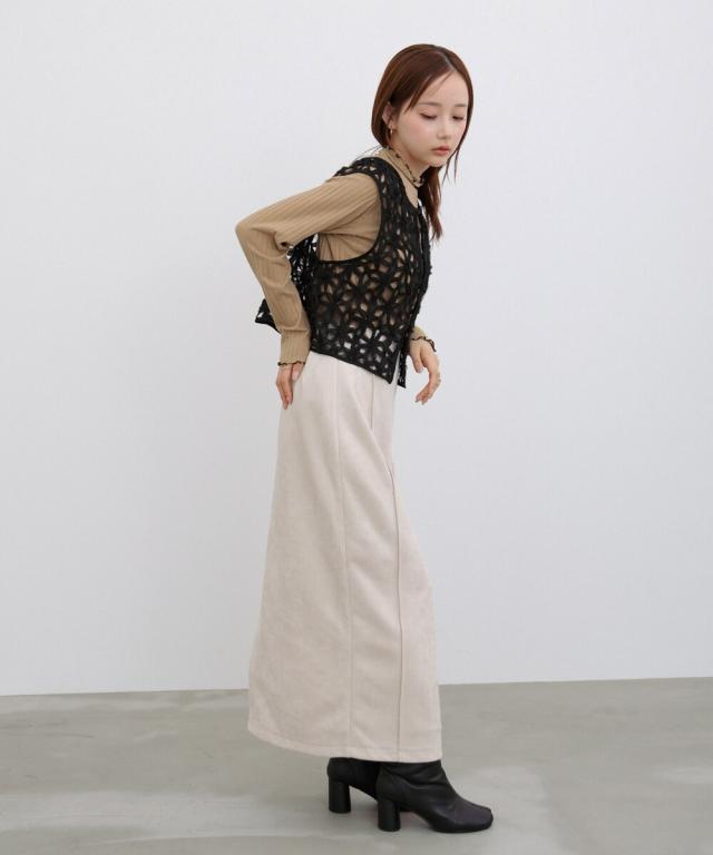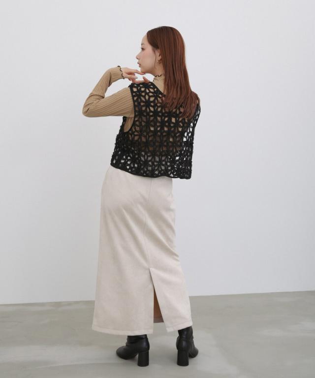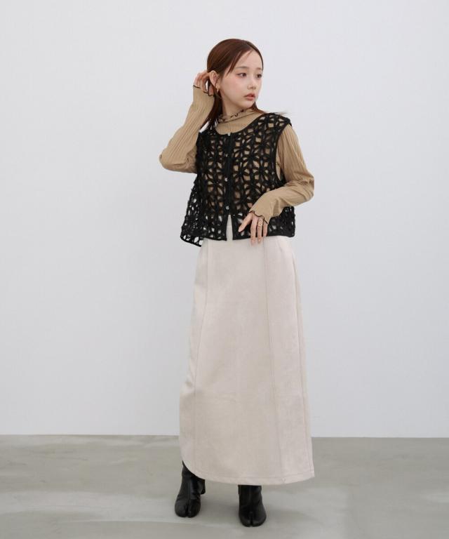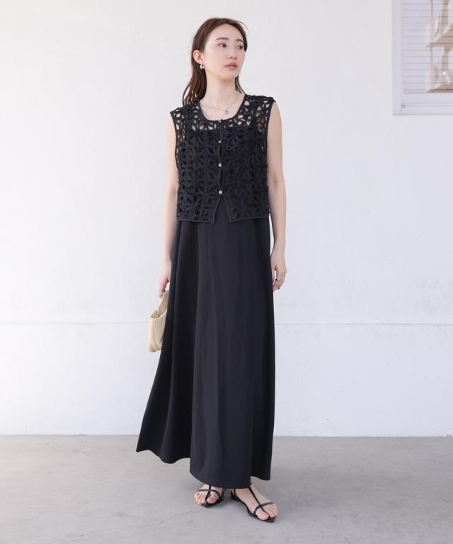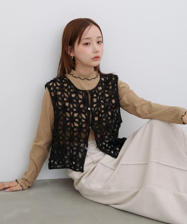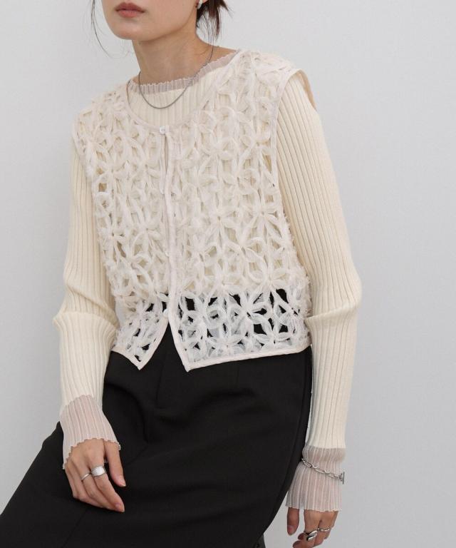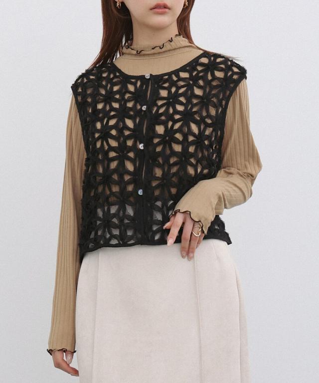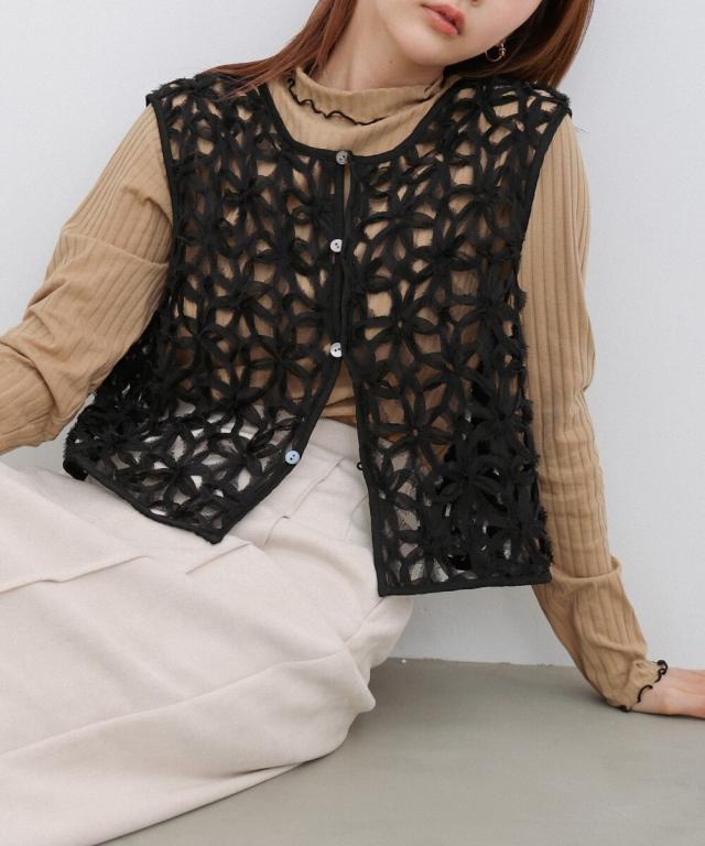 凹凸感のある立体的な断ち切りのモチーフが華やかな前後2WAYベスト。控えめな光沢感のレース地に貝ボタンをあしらった可愛らしいアイテムです。首回りや丈感など1枚ではもちろん、レイヤーとしても着回ししやすいサイズ感なのでコーディネートのアクセントとして持っておきたい1枚です!