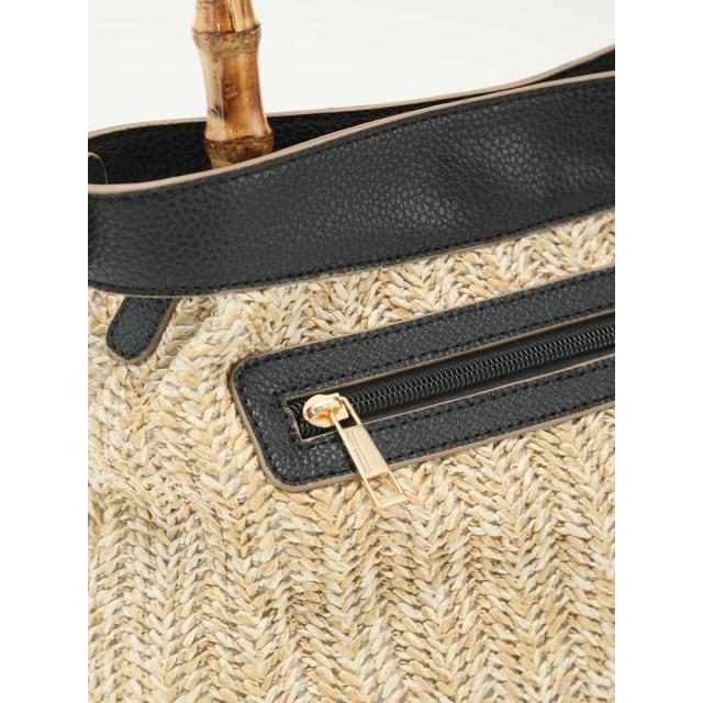 春夏らしい季節感がある、軽くて丈夫なペーパー素材を編みこんでいます。型押しの合成皮革はシュリンクレザーのような凹凸と細かいシワ(シボ)が特徴。持ち手部分はバンブーハンドルを採用しています。