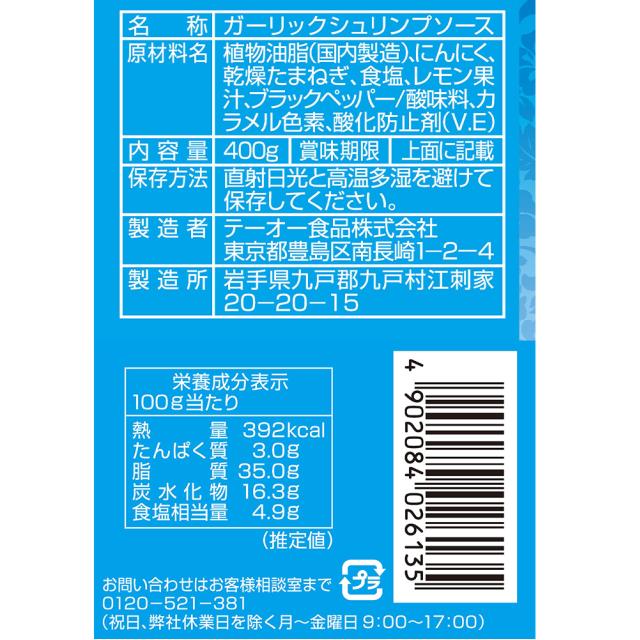 商品名 テーオー食品 ガーリックシュリンプソース 400g×3個 容量 400g×3個 原材料名 植物油脂(国内製造)、にんにく、乾燥たまねぎ、食塩、レモン果汁、ブラックペッパー/酸味料、カラメル色素、酸化防止剤(V.E) アレルギー特定原材料 — 賞味期限 商品の発送時点で、30日以上あるものをお届けいたします 保存方法 直射日光、高温多湿を避けて保存してください。