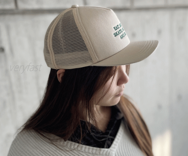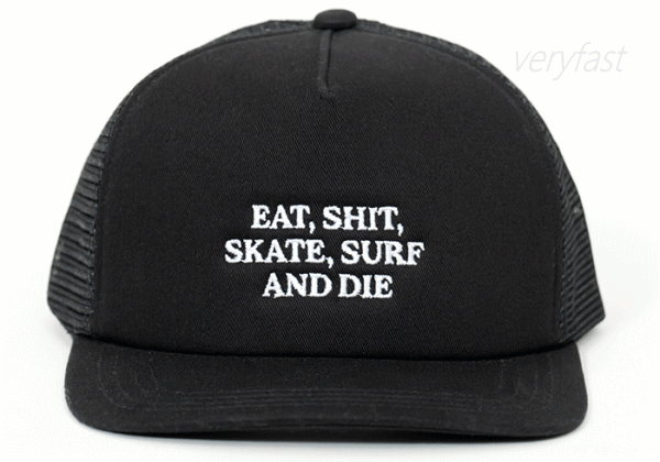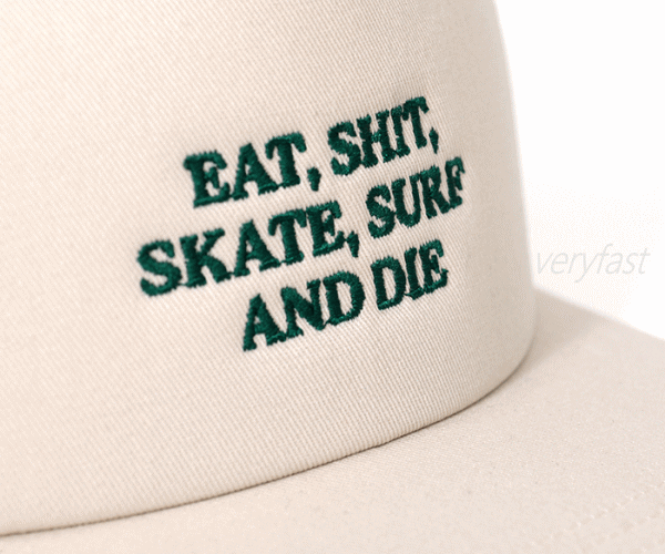 EAT, SHIT, SKATE, SURF AND DIE。定番メッシュキャップ。サーフィンやスケートボードなど西海岸カルチャーと親和性の高いメッシュキャップ。古着とも合わせやすい時代を超えて愛される定番アイテムです。フロントには丈夫なコットンツイル生地を使用し日常使いからアウトドアまで活躍する年中調子の良いキャップ。Eat Shit and die(クソくらえ)というスラングをアレンジしたフロントレターデザインには“どうせいつか終わりが来るなら自分らしくやりたいことを全力で楽しもう”という意味を込めました。使い込むほどに風合いが増し経年変化を楽しめます。■サイズ:FREE■素材:綿100%、ポリエステル(メッシュ)100%■カラー:ブラック、ネイビー、オレンジ、オフホワイト■生産国:中国※手洗いのみ洗濯機不可です。【代引&同梱&配達日時指定不可・北海道&沖縄&離島(中継)地域送付不可】