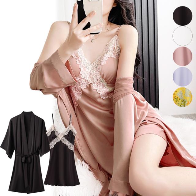・艶めくサテンのセクシーランジェリースリップ&ガウンセット