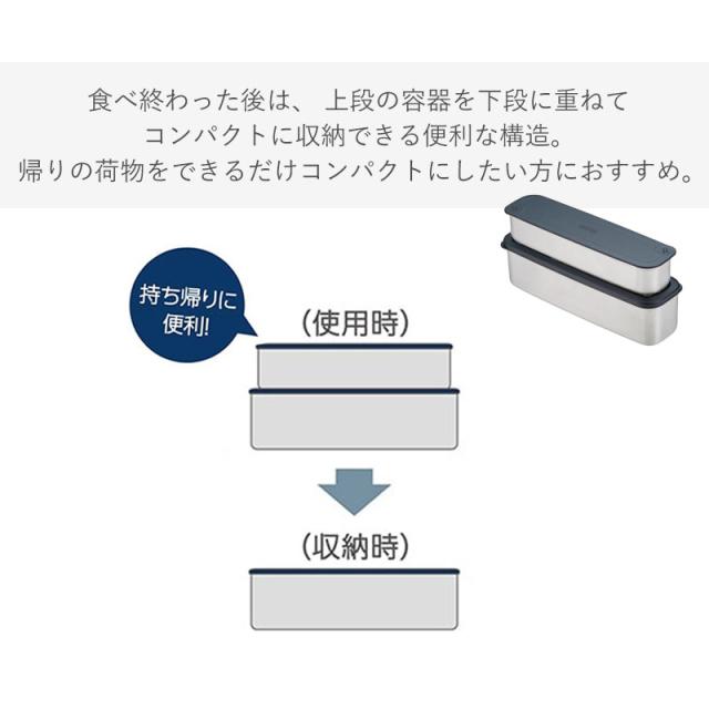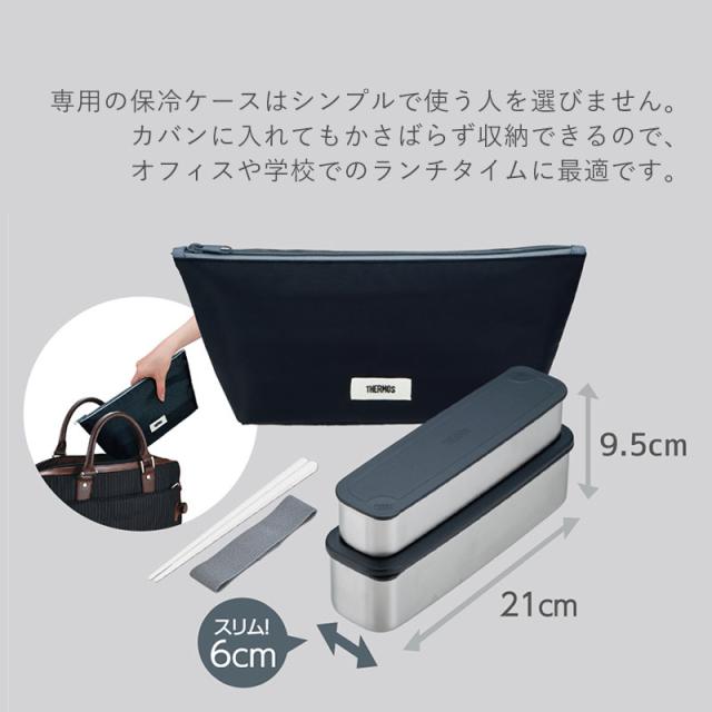 THERMOSの2段式ランチボックスは、ステンレス製でパッキン付き。 スリムなデザインでバッグに入れやすく、専用のシンプルな保冷ケースが付属しています。 奥行き6cmのスリムなフォルムで、カバンの中でもかさばらずすっきり収まります。 通勤や通学にも持ち運びやすい設計です。 全パーツが食洗機対応なので、お手入れがラクでいつでも清潔に。 上段の容器を下段に重ねて収納できるため、持ち帰り時にかさばらずスッキリまとまります。 専用の保冷ケースに入れることで、保冷効果がアップ。 暑い季節でもお弁当の鮮度をキープし、美味しさを長持ちさせます。 「THERMOS」、「サーモス」はサーモス株式会社の登録商標、または商標です。 |