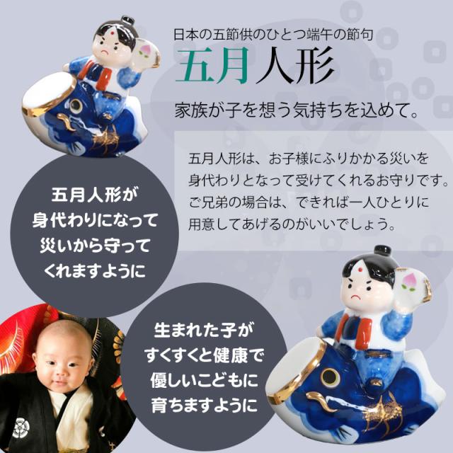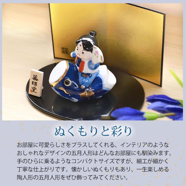 輝かしい未来へ祈りを込めた五月人形。男児の成長の願いを込めて、ぬくもりを感じる五月人形です。 特別な日となる端午の節句を、伝統を残しつつ可愛らしい人形が個性豊かに彩ります。 明るく柔らかな色彩でモダンに飾れる五月飾りです。 輝かしい未来へ祈りを込めた五月人形。男児の成長の願いを込めて、ぬくもりを感じる五月人形です。 特別な日となる端午の節句を、伝統を残しつつ可愛らしい人形が個性豊かに彩ります。 明るく柔らかな色彩でモダンに飾れる五月飾りです。 可愛らしいコンパクトサイズですので、飾り場所を悩むことなく毎年気軽に出すことができます。手作りの陶器製の五月人形は品が有りそして、親しみやすく飾りやすいサイズ感も人気です。 本格的な五月人形は、5月5日を過ぎたら後片付けに手間がかかりますが、こちらはしまうのも簡単です。 お部屋に可愛らしさをプラスしてくれる、インテリアのようなおしゃれなデザインの五月飾りはどんなお部屋にも馴染みます。 手のひらに乗るようなコンパクトサイズですが、細工が細かく丁寧な仕上がりです。 懐かしいぬくもりもあり、一生楽しめる陶人形の五月人形をぜひ飾ってみてください。 心を込めた贈り物にもご自宅用にも好適です。出産祝いや小さなお子様のいるご家庭へのプレゼントとしても喜ばれています。 また、日本文化を海外の方に紹介するため、海外へのお土産としても人気です。 「薬師窯」 薬師窯のやきものは、眼病に御利益があるといわれた「お薬師さん」のご加護を受け、多くの人々の目を楽しませると共に、日々の暮らしに安らぎを与えています。 5月5日のこどもの日には五月人形を飾るご家庭が多いと思います。 五月人形は、お子様にふりかかる災いを身代わりとなって受けてくれるお守りです。ご兄弟の際は、できれば一人ひとりに用意してあげるのがいいでしょう。ただ、飾るスペースの問題もあるので、長男が【鎧飾り】なら次男には【兜飾り】と分けたり、【子供大将・金太郎飾り】や【武者人形】を添えるなどして、お祝いをしてあげてはいかがでしょうか。 また、現代では省スペースで気軽に飾ることができるコンパクトな五月人形が人気です。 飾る時期は地域によって違いがありますが、一般的には春のお彼岸すぎから遅くとも4月中旬までに飾ります。しまう時期は、天気のいい乾燥した日を選んで5月中旬までにはしまいましょう。 端午の節句は菖蒲の節句とも呼ばれ、鎧・兜・刀・武者人形や金太郎を模した五月人形を室内に飾り、庭前にこいのぼりを立てて男の子の成長を祝い、健康と立身出世を祈るお節句です。 お子様の健やかな成長を願う気持ちが込められているのです。 |