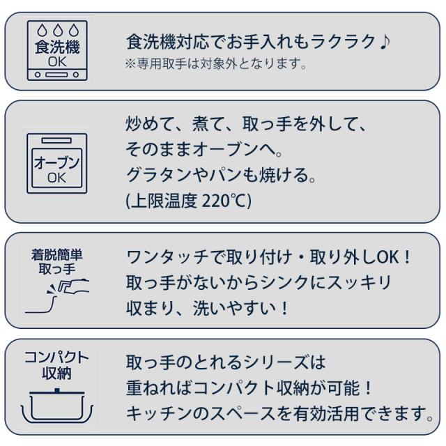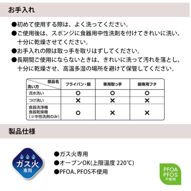 ・ガス火専用 ・オーブンOK(上限温度 220℃) ・フライパン、お鍋は食洗機OK(中性洗剤に限る) |