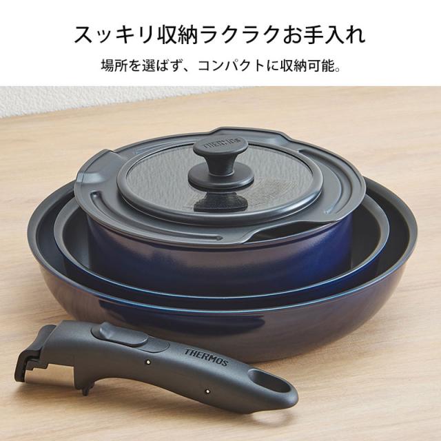 THERMOS サーモス フライパンセット 取っ手のとれるフライパン セット 5点 ガス火専用 食洗機対応 蓋 付き 取っ手取れる フライパン お鍋 フタ 取手 省スペース 深型設計 KSE-5A ディープブルー 送料無料