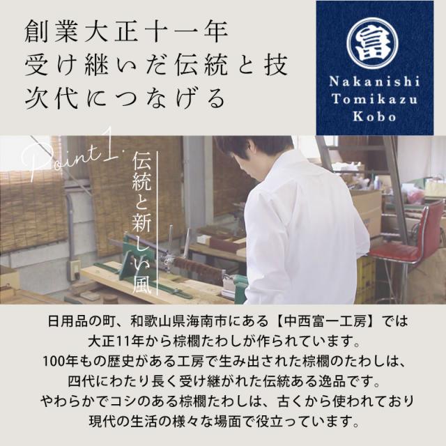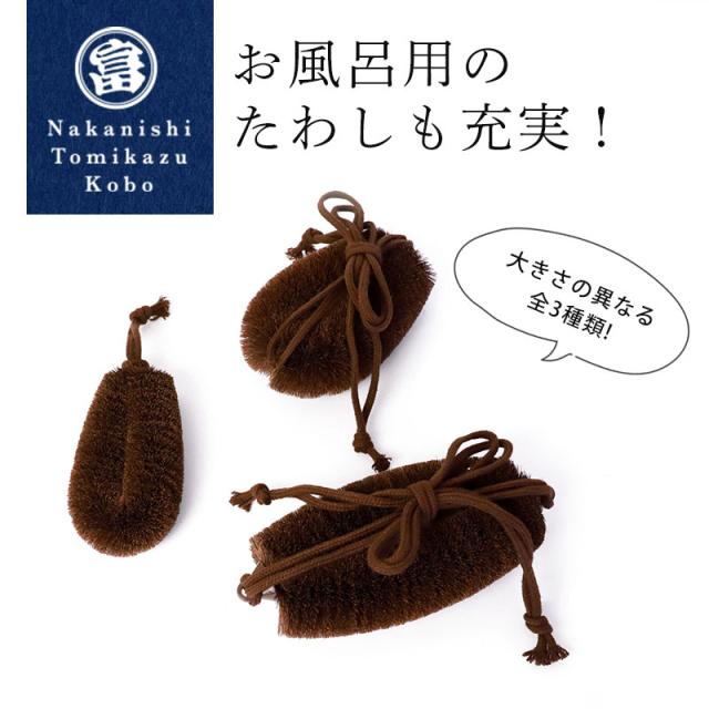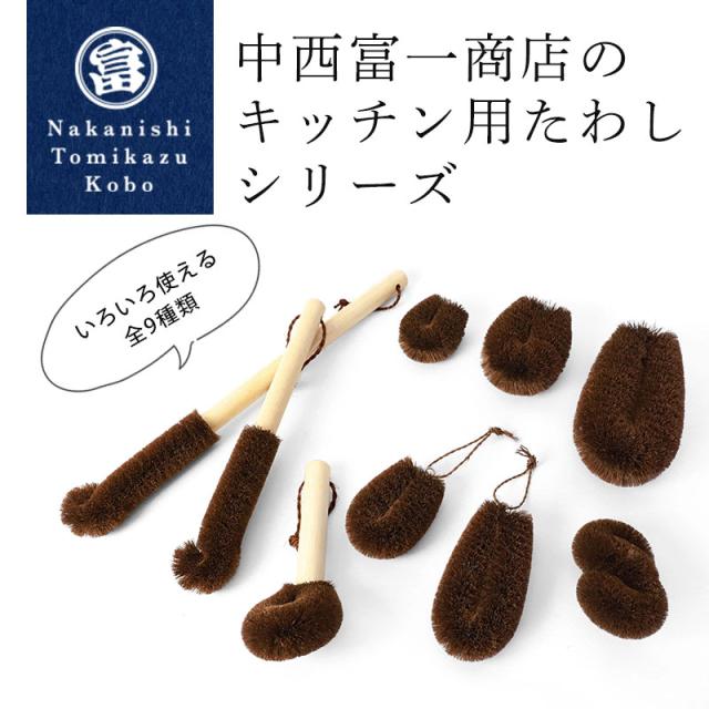 | 商品説明 | 深くて洗いにくい水筒やポットを、すみずみまでしっかり洗える棕櫚たわしです。 先端が角や隅にフィットしやすい形状なので、今まで洗いにくかった水筒やポットの底までしっかり届きます。 水筒などの肩部分の内側や底のスミの汚れもスムーズに落とせるように工夫されています。 長めの木柄を採用し、深めのポットや水筒にも対応。持ちやすく、力を入れやすいのでしっかり洗えます。 一日中お茶やコーヒーを入れていると、どうしても気になる色素沈着。 強い洗剤を使わなくても、しっかり擦ればすっきり綺麗に。お気に入りの水筒を、いつでも清潔に保てます。 棕櫚繊維はしなやかでコシがあり、適度な弾力があるため、水筒やポットを傷つけにくいのも特徴。毎日の洗い物が快適になります。 お子様の水筒から家族みんなの麦茶ポットまで、これ一本でスッキリ洗浄。いつでも気持ちよく、清潔な毎日が送れます。 ■棕櫚(シュロ)とは 日本の里山で見ることのできるヤシ科の常緑植物です。幹の周りの皮を編んで作られる棕櫚縄、棕櫚マットなどがあるように、繊維はしなやかで非常に丈夫です。 棕櫚たわしは、天然素材で作られているため環境に優しく、持続可能な選択肢として注目されています。 その柔らかな質感は、食器や鍋、フライパンを傷つけることなく、やさしく洗い上げてくれます。 天然の棕櫚を使ってひとつひとつ手作業で作られた棕櫚たわしは、やさしい手触りと使い心地が特徴です。食器や野菜などにも安心してご使用いただけます。 ■キッチン用たわしとしての特徴 棕櫚から作られたたわしは、うつわやコップの汚れを繊維が掻き出すように洗います。 適度な硬さとしなりを持った天然の棕櫚ですので、大切な食器の表面を傷つけることなく、汚れだけを落とします。 また、野菜の泥落としにも最適で、表面を傷つけることなく泥だけを落とすため、食物繊維や旨みを損なうことなく洗えます。 食材を繊細に扱うプロの料理人にも愛される品質で、ご家庭のキッチンでさまざまなシーンに寄り添う頼れる存在となるでしょう。 ■中西富一工房のこだわり 中西富一工房は大正11年(1922年)創業以来、100年以上の伝統を受け継ぎながら、職人の技術を活かした高品質な棕櫚たわしを作り続けています。 天然素材のシュロは一本一本の太さや硬さが異なり、その日の気候や湿度によっても状態が変わるため、職人が手の感触を頼りに一本ずつ丁寧に仕上げています。 「自工房でひとつひとつ心をこめてつくる」——それが中西富一工房のものづくりへのこだわりです。 |