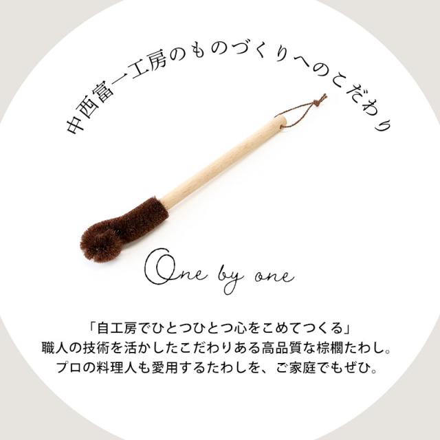 柄付き棕櫚たわし ロング 日本製 キッチン 水筒洗い ボトルブラシ 洗いやすい 洗い物 手荒れ対策 傷つけない 台所 ブラシ 食器 皿洗い 水仕事 哺乳瓶洗い 棕櫚 和歌山県 海南市 中西富一工房 しゅろたわし タワシ 無農薬 束子 おしゃれ たわし シュロ 棕櫚キッチンブラシ