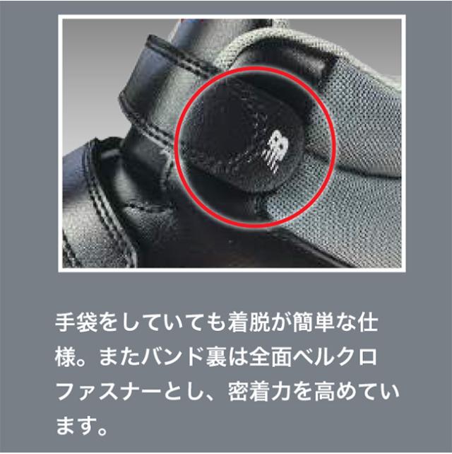 ・手袋をしていても着脱が簡単な仕様。またバンド裏は全面ベルクロファスナーとし、密着力を高めています。