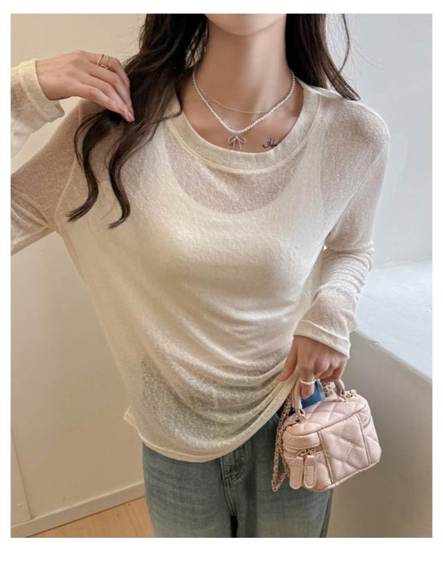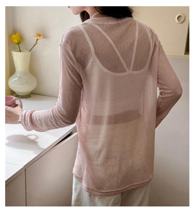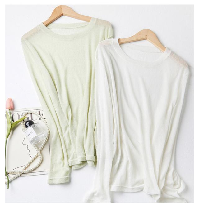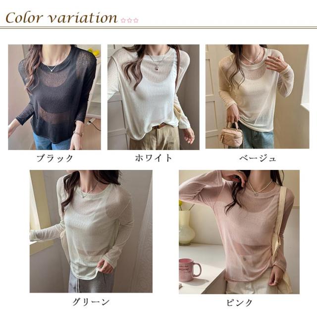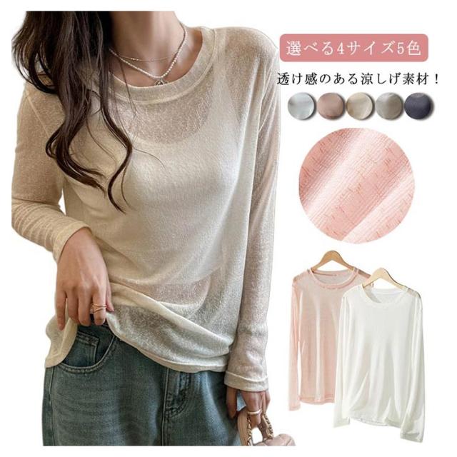 長袖 シアートップス 透け感 トップス 涼しい UVカット シアートップス カットソー 夏 レディース ラウンドネック 無地 重ね着