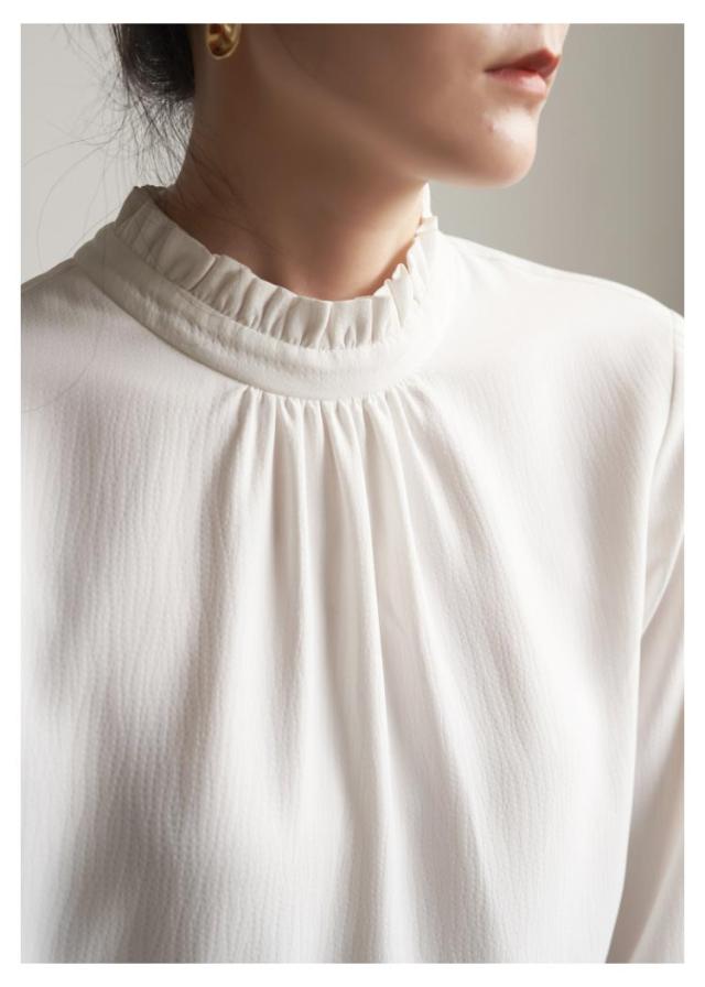 | 衿元のフリルが華やかなブラウス! 少しリラックスしたサイズ感のシルエットで、堅苦しくならずに今っぽい雰囲気。 通勤から入学式、卒業式、入園式、卒園式、結婚式など様々なシーン大活躍! | |