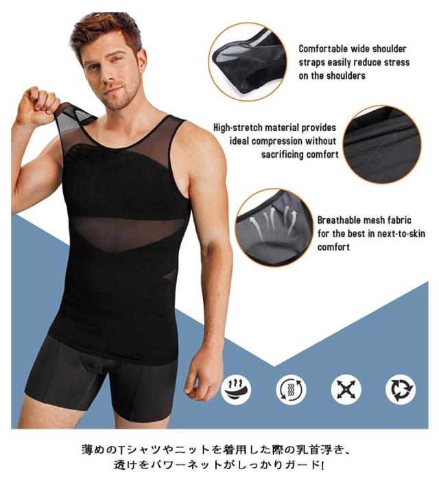 | 【加圧インナー】【S〜4XL】 補正インナーとしても、スポーツ時の加圧シャツとしても、姿勢を綺麗に見せる下着としてもマルチに使えるインナーアイテムです。 薄めのTシャツやニットを着用した際の乳首浮き、透けをパワーネットがしっかりガード! 自然なフラットなシルエットに見せられるので、いつものお洋服のインナーに使うだけで一気にスタイリッシュなルックスに仕上がります。 【下腹部も引き締める】 エックスラインのストレッチ補正ベルトが気になる下腹部もしっかりと抑え込みます。背中側にもクロスラインの補正ベルトを施し 同時に猫背も補正。 きれいな姿勢を保ち、自信あふれる印象に。毎日着用する事で正しい姿勢も身につきます。 【加圧トレーニングにも】 しっかりと圧がかかるので効果的なトレーニングが可能。 ゴルフやジム、ジョギングの際にも胸や贅肉が揺れるのを防ぐため快適にワークアウトを楽しむことができます。 | |
