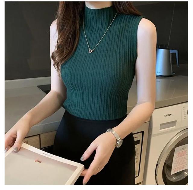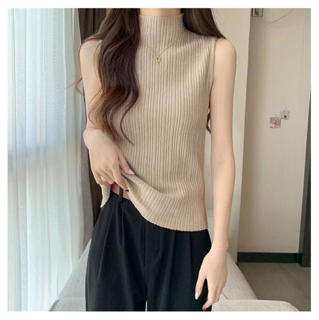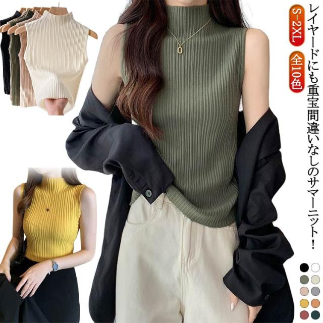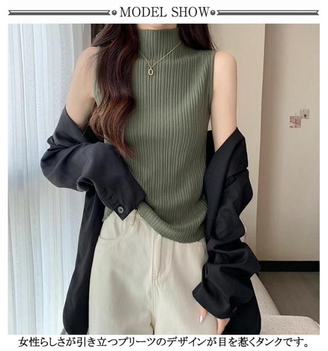プリーツ タンクトップ ニットトップス Tシャツ ノースリーブ レイヤード プリーツ ストレッチ サマーニット ハイネックニット シンプル ハイネック 春 夏 全10色 トップス S M L XL 2XL 大きいサイズ
