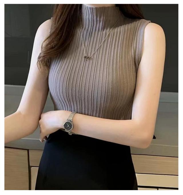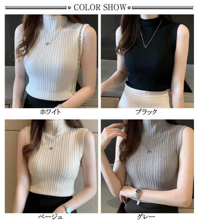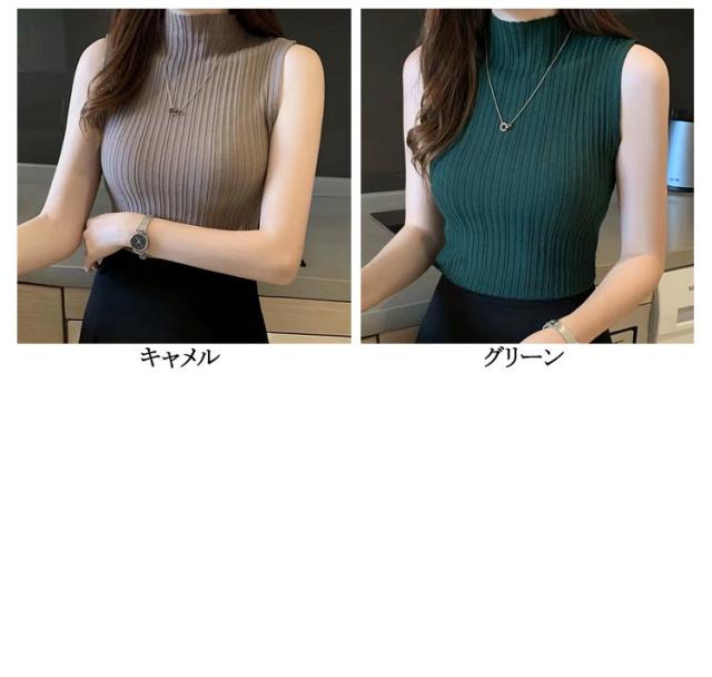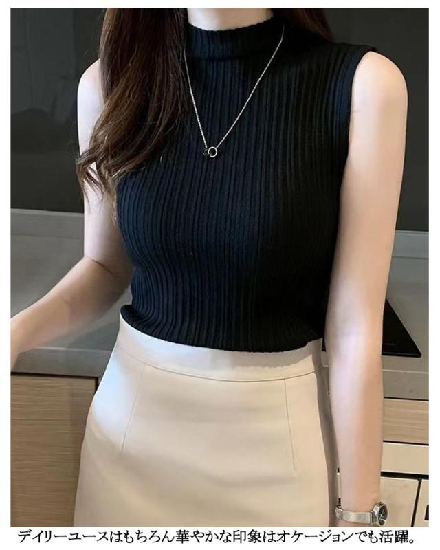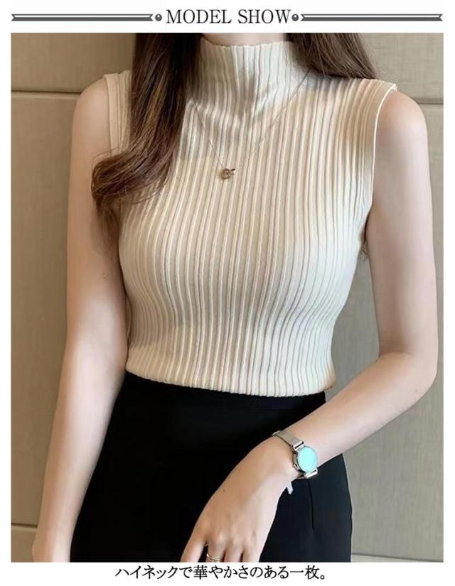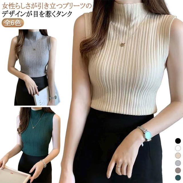 ニットトップス ハイネック レディース ノースリーブ シンプル プリーツ トップス ストレッチ ハイネックニット 夏 Tシャツ タンクトップ 春 全10色 レイヤード サマーニット S M L XL 2XL 大きいサイズ