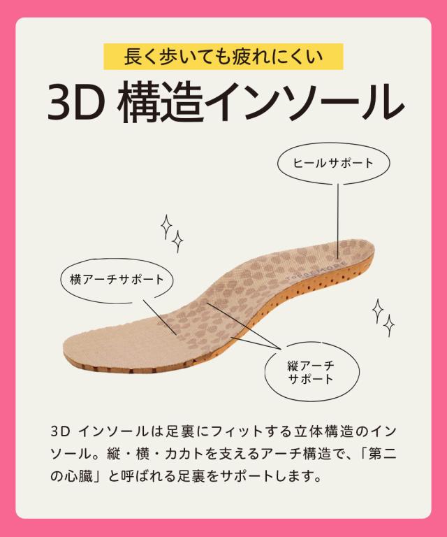 立体型“3D構造のインソール”でクッション性を高めているので、疲れにくくなっています。