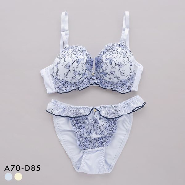ツヤツヤと光沢の美しい色糸で、香り立つようなローズ刺繍をあしらったスウィート&クラシカルなブラセット。カップアンダーやショーツウエストにメロウフリルをあしらい、華やかさと愛らしさをプラスした凝ったデザインです。