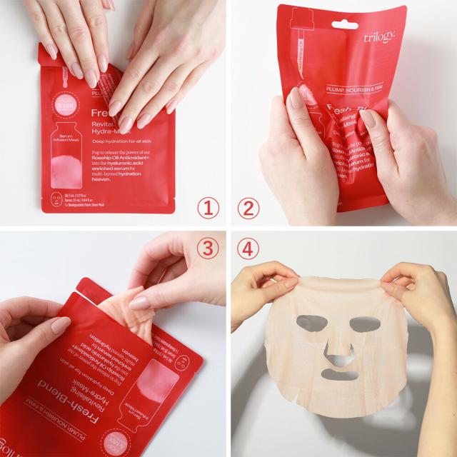 1.オイルとセラムをプチッと混ぜる パウチの上部を下に向かって折りたたみながら、上段のオイル層をプチッと押し込み、下段のセラム層と混ぜ合わせます。 2.しっかりと揉み込む オイル層とセラム層が混ざるよう、約1分ほどパウチをしっかりと揉み込みます。 3.マスクを取り出し、お顔に密着させる パウチの下部を破り、マスクを取り出して広げます。洗顔後の清潔な肌にお使いください。目と口の位置を合わせて、お顔全体に密着させます。 4.15〜20分置いて、なじませる 15〜20分ほど置いて、マスクをはずします。残ったセラムをやさしく肌になじませます。その後、お好みの美容液や保湿クリームをお使いください。