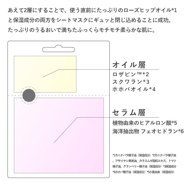 じゅわっとうるおい滲む、多幸感肌へ。 トリロジーオリジナル成分のロザピン™*1にヒアルロン酸*2、フェオヒドラン*3をキー成分として配合した2層式シートマスクです。最大の特徴は袋の中で分かれている「オイル層」と「セラム層」を使用する直前にフェイスシートに馴染ませるということ。そうすることで、たっぷりのローズヒップオイルと保湿成分の両方をシートマスクにギュッと閉じ込めることに成功しました。たっぷりのうるおいで満ちた、ふっくら柔らかな肌へと導きます。 *1カニナバラ種子油、アサイヤシ果実油、カラスムギ穀粒エキス、トマト種子油、クランベリー種子油(保湿成分)*2ヒアルロン酸Na(小麦由来)(保湿成分)*3グリセリン、加水分解アルギン、海水、クロレラエキス(保湿成分)