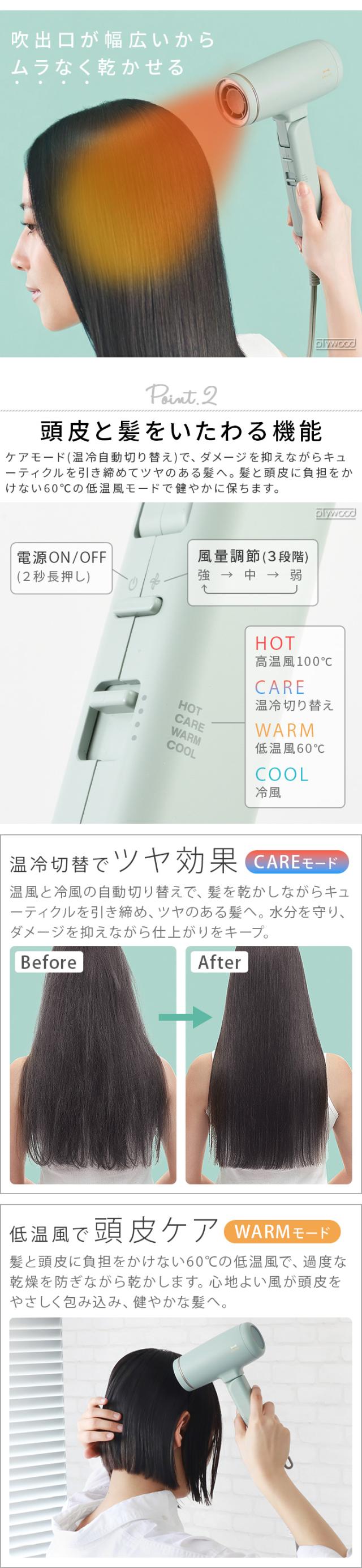 | マイナスイオン(全モードで放出)、ケアモード(自動温冷切り替え)、風量3段階(強/中/弱)、温度3段階(100℃/60℃/冷風) |