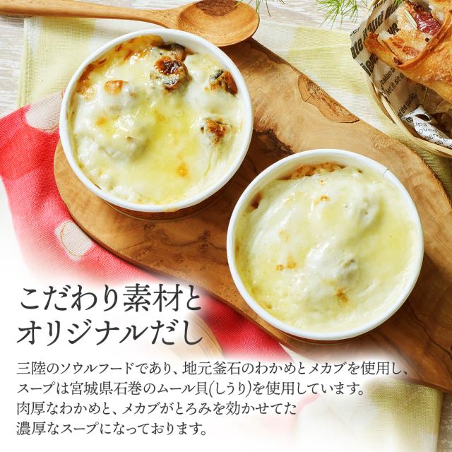 牡蠣ドリア:米(岩手県産)、牛乳(岩手県産)、生クリーム(国産)、牡蠣、チーズ、バター、小麦粉、出し汁(さば節、昆布、するめいか)、醤油(大豆・小麦を含む)、酒、みりん、砂糖、塩、胡椒