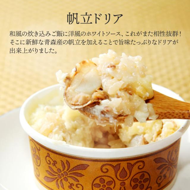 原材料名: 帆立ドリア:米(岩手県産)、牛乳(岩手県産)、生クリーム(国産)、帆立、チーズ、バター、小麦粉、出し汁(さば節、昆布、するめいか)、醤油(大豆・小麦を含む)、酒、みりん、塩、胡椒、しょっつる