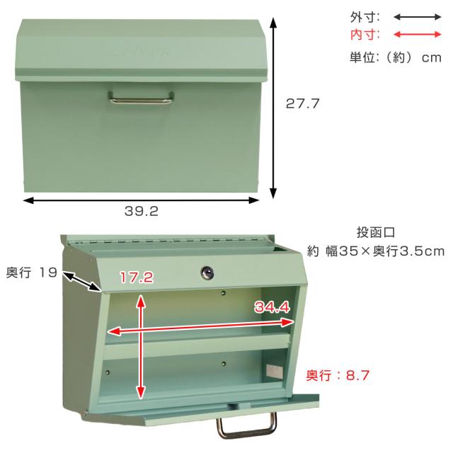 | サイズ | 約 幅39.2×奥行19×高さ27.7(cm) 投函口サイズ:約幅35×奥行3.5cm 取出口:約幅34.4×奥行8.7×高さ17.2cm |