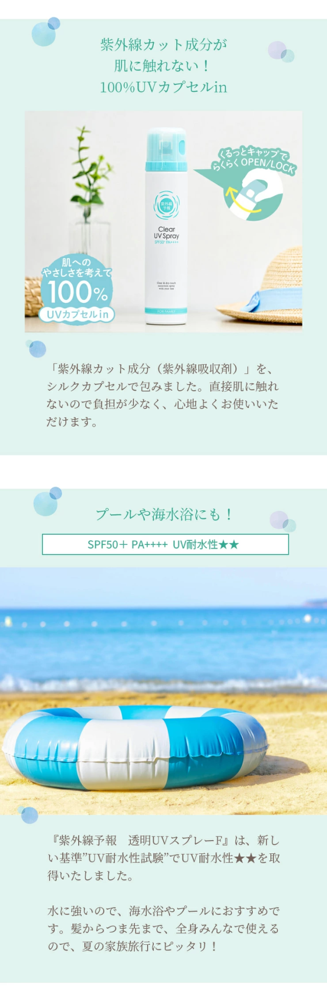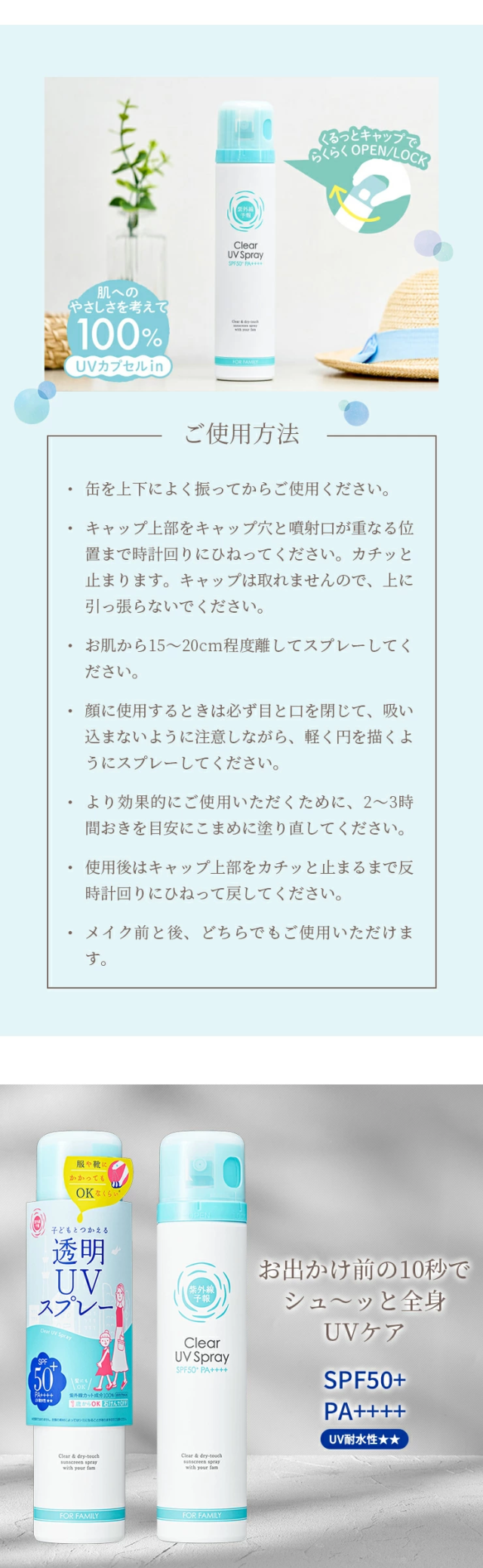 | 髪・体・顔を1本でケアできるたっぷりサイズの日やけ止め。 お出かけ前のバタバタで時間がない時でも、これ1本であっという間に全身のUV ケアが完了します。 服や靴にかかってもOK なくらい透明なのも嬉しいポイント! サンダルを履いた後でも使えるから、玄関に常備するのがおすすめです。 ※衣類用ではありません。衣類の素材によってはシミになることがありますのでご注意ください。 「紫外線カット成分(紫外線吸収剤)」を、シルクカプセルで包みました。 直接肌に触れないので負担が少なく、心地よくお使いいただけます。 海外の一部で規制されている紫外線吸収剤を使っていない&新しい基準”UV耐水性試験”でUV耐水性★★を取得しています。 水に強いので、海水浴やプールにおすすめです。 髪〜つま先まで、全身みんなで使えるので、夏の家族旅行にピッタリ! ・髪・体・顔用 ・SPF50+ PA++++ UV耐水性★★ ・1歳からOK ・石けんでOFF ・紫外線カット成分 100%UVカプセルin ・無色素、無香料、無鉱物油、ノンパラベン、ノンアルコール ・カサつく肌のうるおい守る!アルブチン・コラーゲン・ヒアルロン酸・7種の植物エキス配合 ・オレンジ精油の香り ・顔、髪、メイクの上からシューッ! ・瞬間サラッとベタつかない ・ロングUVAもブロック ・何回重ねても白浮きしない ・石けんで簡単OFF 【シーズン限定品】 毎年、3月初旬〜7月頃まで期間限定販売を行っているシリーズです。売れ行き次第で予定より早く販売を終了する場合がございます。予めご了承ください。 【使用期限】未開封3年、開封後6ヶ月を目安にお使いください。 |