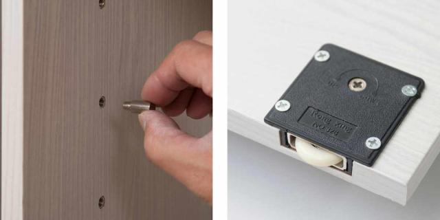 | 安心の棚受け 棚受けはネジ式ダボなので、一度はめると取れなくなったり、スポッと取れて棚板が落ちる心配もありません。 | 滑車付き扉で開閉楽々 扉には滑車が付いているので、開閉がスムーズにできます。 |
