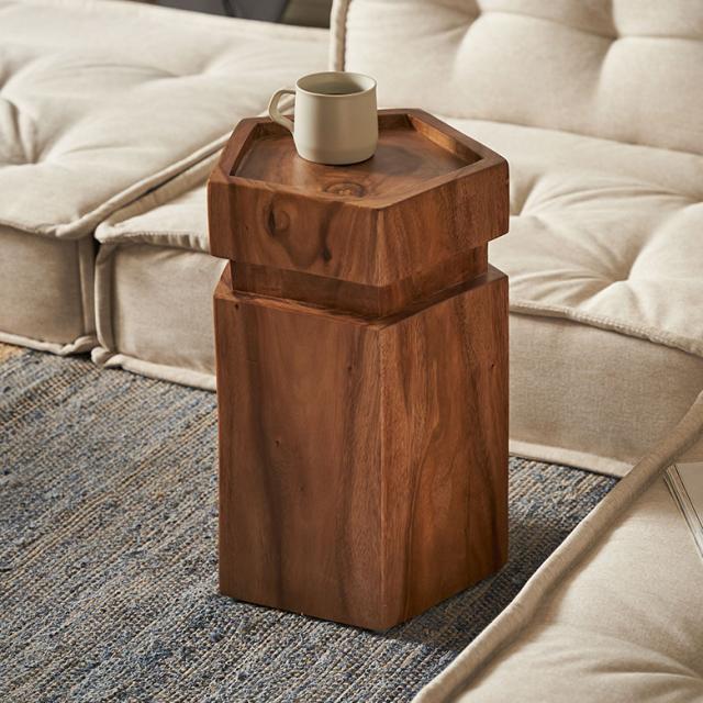 モンキーポッドツリー(スワールウッド)を贅沢に使用した、スタイリッシュなペンタゴンシェイプのウッドサイドテーブル。無垢材の割れや風合いを活かしたヴィンテージライクなデザインが魅力です。南米ウォルナットとも呼ばれるモンキーポッドは、濃茶色の美しい木目と温かみのあるナチュラルな質感が特徴です。インドネシアの職人の手作業で作り上げたサイドテーブルは、無垢材ならではの滑らかな仕上がりと、唯一無二の存在感を持ちます。内側を空洞にすることで軽量化しつつも、重厚感をしっかりと感じられる構造になっています。