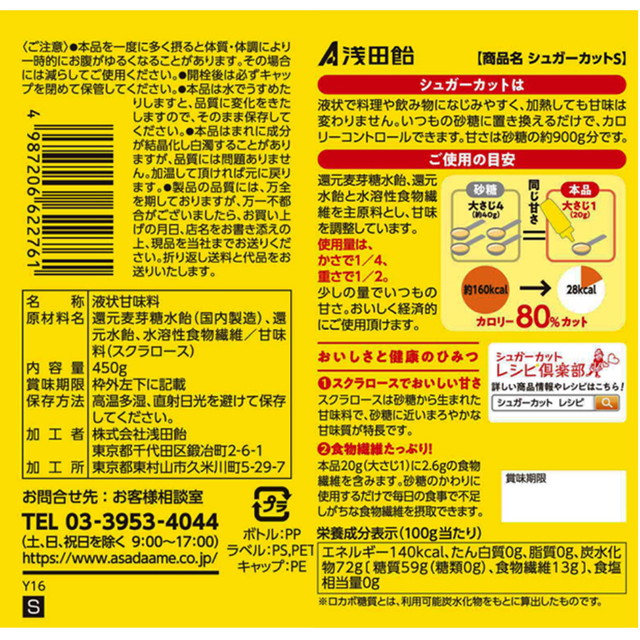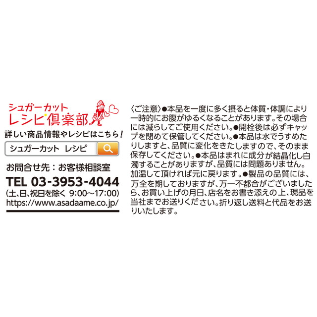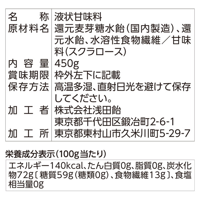 商品名 浅田飴 シュガーカットS 450g×6本 容量 450g×6本 原材料名 還元麦芽糖水飴(国内製造)、還元水飴、水溶性食物繊維/甘味料(スクラロース) アレルギー特定原材料 ー 賞味期限 商品の発送時点で、30日以上あるものをお届けいたします 保存方法 直射日光、高温多湿を避けて保存してください。