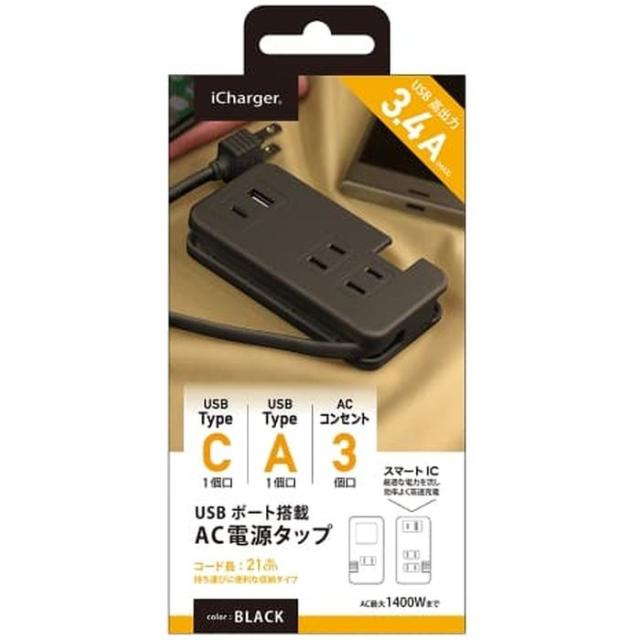 「PG-UACTAP03BK」は、AC差し込み口3個とUSB Type−Cポート1個、USB Type-Aポート1個のAC電源タップです。スマートフォンやタブレットの充電時にアダプターがなくても直接電源タップに差し込み充電可能。また、スマートICがUSBに接続した機器を自動検知し、最適な電流を送って素早く充電してくれます。USB最大合計3.4Aまで2台同時充電が可能、ACコンセント最大合計1400Wまで出力が可能です。持ち運びに便利な収納型。