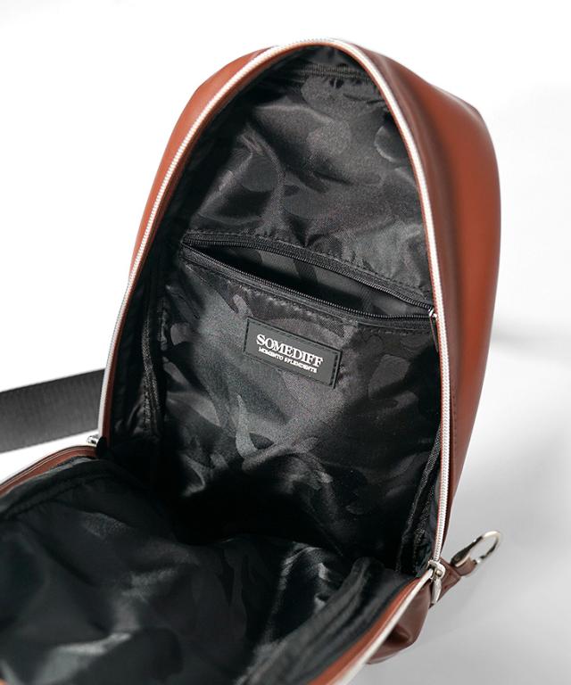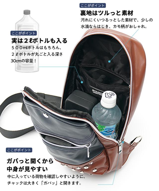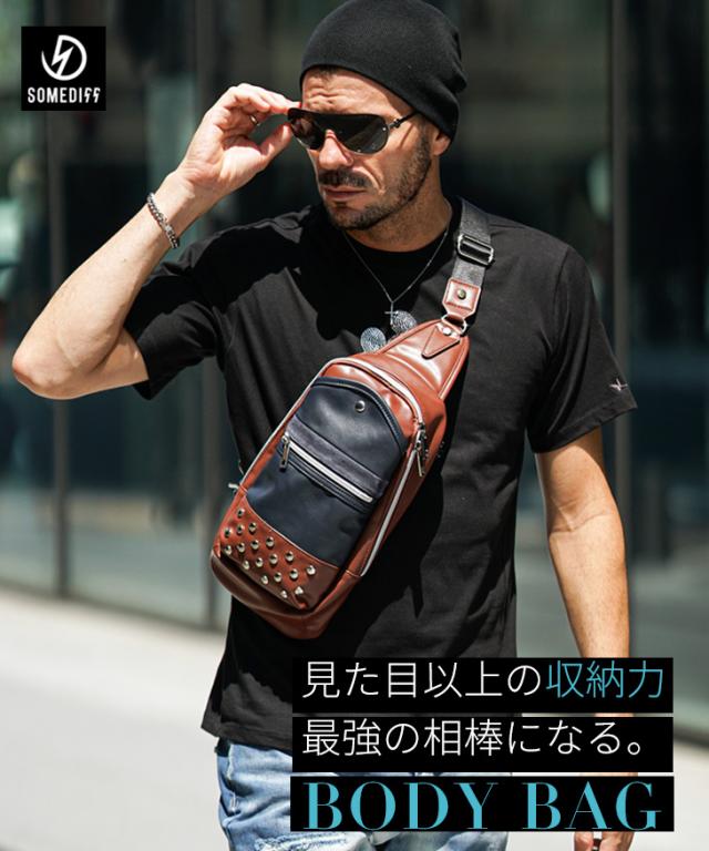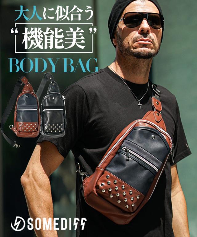 SOMEDIFF(サムディフ) 『スタッズボディーバッグ』【スタッズボディーバッグ】高級感のあるPUレザーと無骨なスタッズデザインが男らしさを感じさせるスタッズボディーバッグ。レザーの上質感が漂うPU素材。こだわりをみせる迷彩柄の裏地は、遊び心と個性をさりげなくアピール。スマホや財布、鍵を分けて収納できる大小4つのポケットで、見た目だけでなく機能性も抜群です。さらに、ストラップは60cmから125cmまで調節可能、左右どちらの肩にも対応する付け替え式で、快適な着用感を実現します。デザイン性も機能性も妥協しない、大人のオトコへ送る唯一無二のボディーバッグだ。