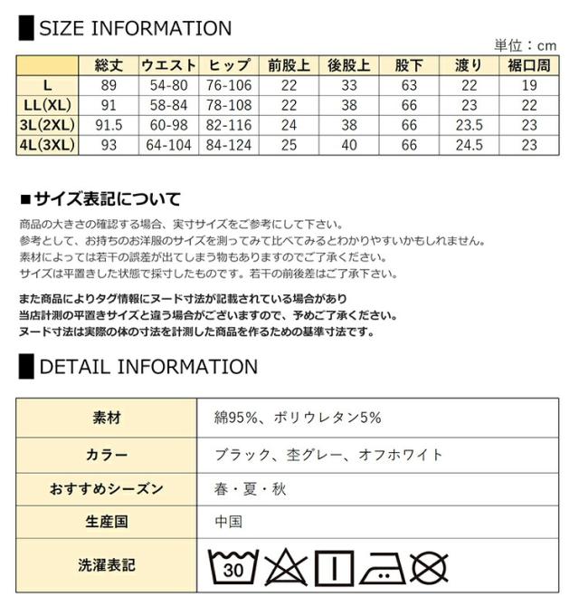4L(3XL):総丈93 ウエスト64-104 ヒップ84-124 前股上25 後股上40 股下66 渡り24.5 裾口周23