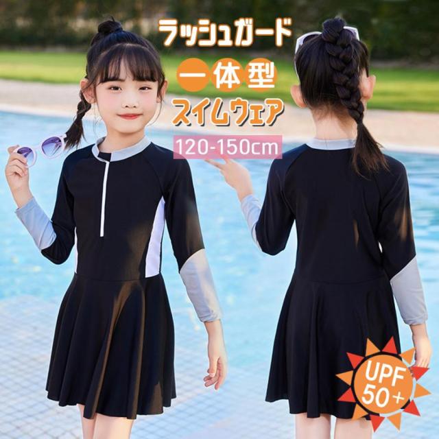 【ラッシュガード一体型】水着 女の子 キッズ ジュニア ワンピース スイムウエア 長袖 おしゃれ シンプル ラッシュガード かわいい プール ビーチ 海 水遊び 夏