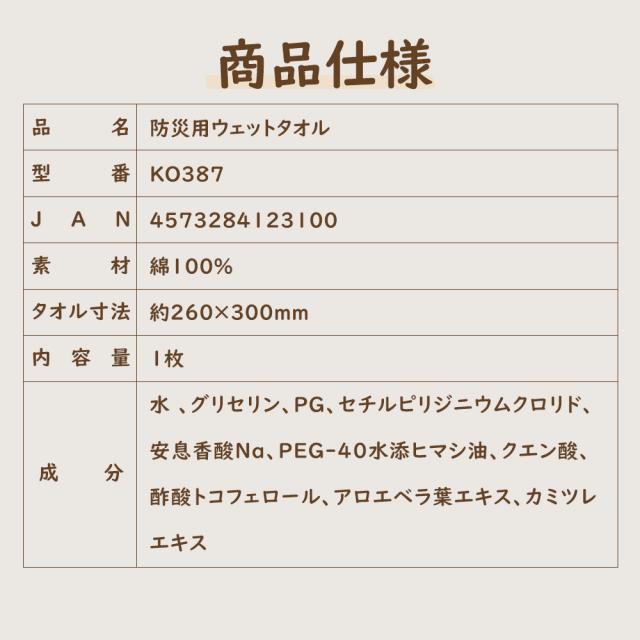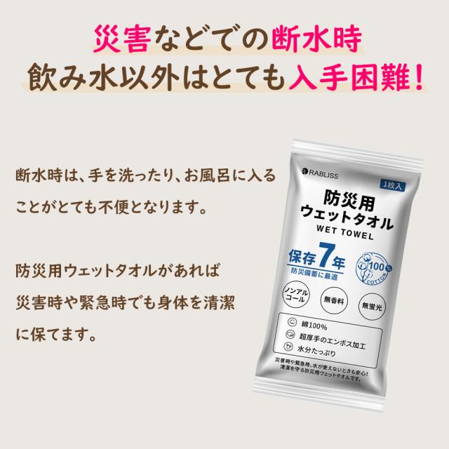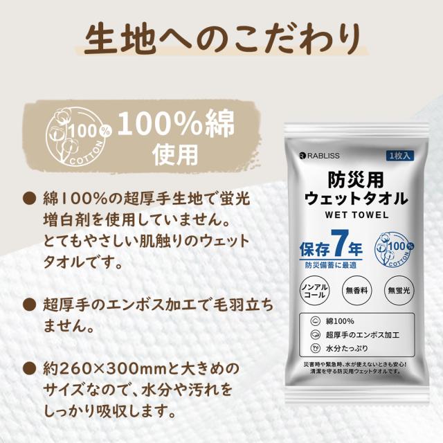 防災ウェットタオル 防災備蓄品 衛生雑貨 避難時 衛生 個包装 無香料 無着色 無蛍光 アルコールフリー エンボス加工 コットン お手拭き