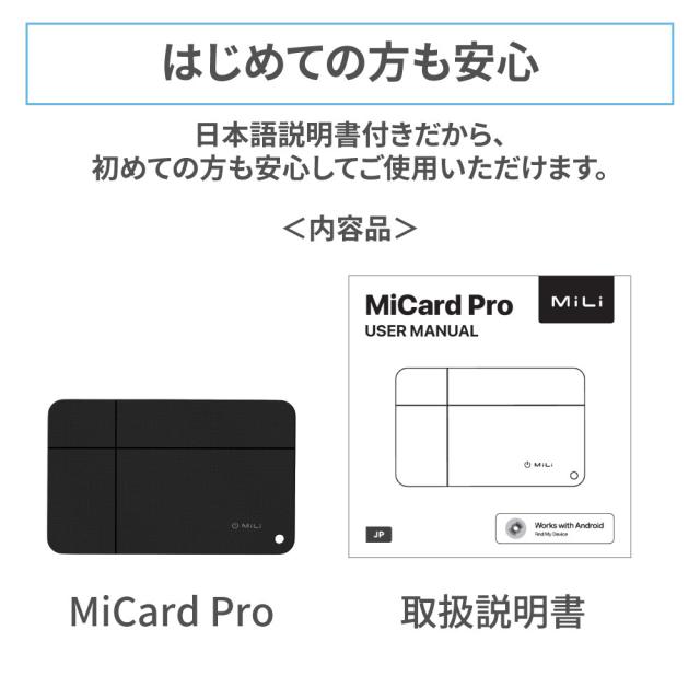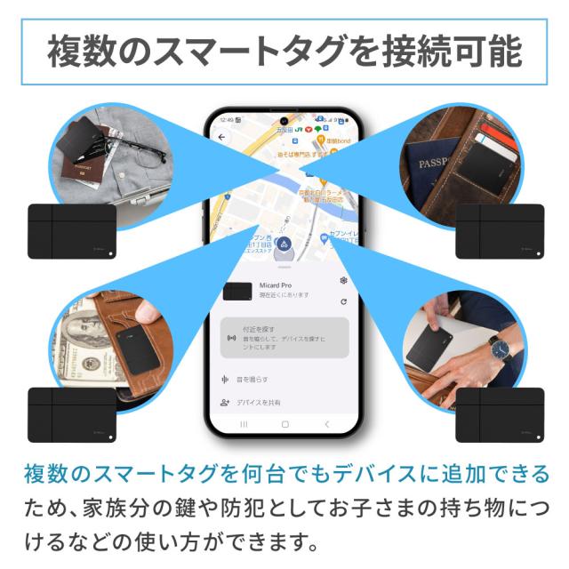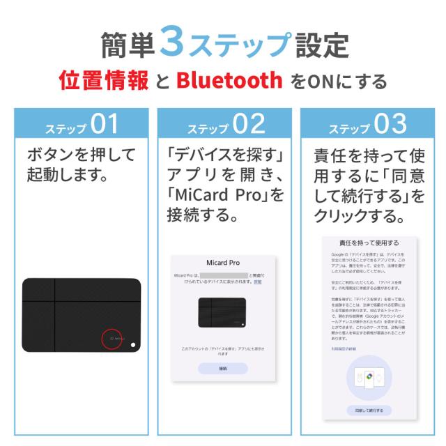 | 使い方 | 簡単3step設定 1.デバイス中央にあるボタンを押して電源を入れます 2.「デバイスを探す」アプリを開き、MiCardを接続します 3.責任を持って使用するに「同意して続行する」をクリックします |