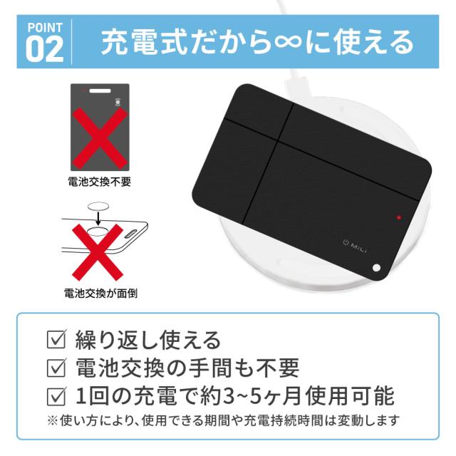 ■Googleの「デバイスを探す」に対応 Googleの「デバイスを探す」ネットワークで財布やカードケースなどの行方を特定できます。 プライバシー保護機能を搭載しているため、安心してご使用いただけます。 スマホから位置をチェックし、持ち物に近づいた時にスマホでMiCardを鳴らすと、アラートが鳴り位置を特定できます。 ■簡単ワイヤレス充電 電池交換の手間もなく、ワイヤレス充電器に置いて充電するだけでお使いいただけます。 1回の充電で約3〜5ヶ月ご使用いただけます。 ※使い方により、使用できる期間や充電持続時間は変動します ※Qi規格対応 ■かさばらない薄さ 薄さわずか2.5mmのため、財布やカードケースに入れてもかさばらずに使用することができます。 ■複数の紛失防止カードを接続可能 複数の紛失防止カードを何台でもデバイスに追加できるため、家族分のカードケースや財布などの持ち物に入れて使うことができます ■大音量ブザー搭載 大音量のブザーにより、クッションなどに隠れていても見つけ出すことができます。 ■技術基準適合証明(技適)取得済み 技術基準適合証明番号:R214-126021 本製品は日本での技術基準適合証明(技適)を取得しています。 技適証明を取得していない商品を日本国内で使用する場合、電波法違反になる恐れがございます。技適証明取得をしている製品のご購入、ご使用を推奨いたします。 ※製品やパッケージへの技適マーク記載は任意のため、本製品には記載がございません。技適証明取得をご確認されたい場合は、総務省 電波利用ホームページよりご確認ください。 |